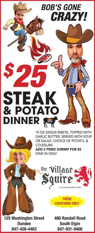 BOB'S GONE CRAZY! $25 STEAK & POTATO DINNER 10 OZ ANGUS RIBEYE, TOPPED WITH GARLIC BUTTER, SERVED WITH SOUP OR SALAD, CHOICE OF POTATO, & COLESLAW. ADD 2 FRIED SHRIMP FOR $5 DINE IN ONLY the Village Squire 125 Washington Street Dundee 847-428-4483 VILLAGESQUIRE.COM THESE LOCATIONS ONLY 480 Randall Road South Elgin 847-931-0400 BOB'S GONE CRAZY ! $ 25 STEAK & POTATO DINNER 10 OZ ANGUS RIBEYE , TOPPED WITH GARLIC BUTTER , SERVED WITH SOUP OR SALAD , CHOICE OF POTATO , & COLESLAW . ADD 2 FRIED SHRIMP FOR $ 5 DINE IN ONLY the Village Squire 125 Washington Street Dundee 847-428-4483 VILLAGESQUIRE.COM THESE LOCATIONS ONLY 480 Randall Road South Elgin 847-931-0400