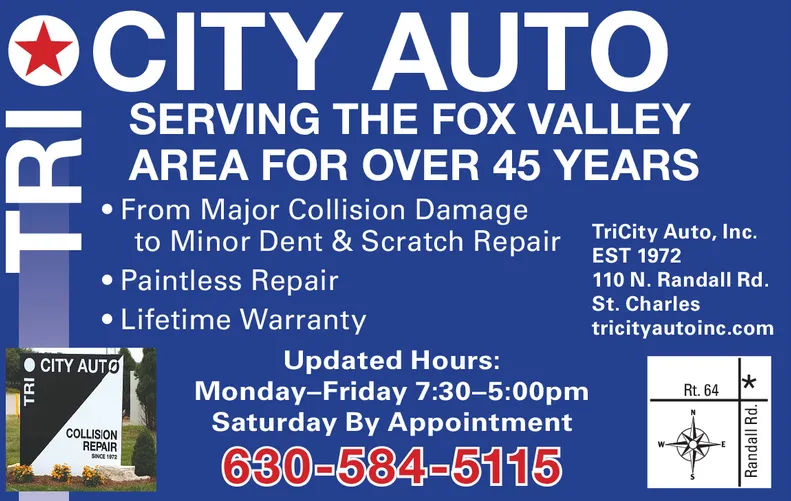 CITY AUTO SERVING THE FOX VALLEY C AREA FOR OVER 45 YEARS From Major Collision Damage to Minor Dent & Scratch Repair TriCity Auto, Inc. Paintless Repair EST 1972 110 N. Randall Rd. Lifetime Warranty St. Charles tricityautoinc.com Updated Hours: Monday-Friday 7:30-4:30pm Saturday By Appointment CITY AUTO Rt. 64 COLLISION REPAIR SINCE 2 630-584-5115 TRI TRI Randall Rd. * CITY AUTO SERVING THE FOX VALLEY C AREA FOR OVER 45 YEARS From Major Collision Damage to Minor Dent & Scratch Repair TriCity Auto, Inc. Paintless Repair EST 1972 110 N. Randall Rd. Lifetime Warranty St. Charles tricityautoinc.com Updated Hours: Monday-Friday 7:30-4:30pm Saturday By Appointment CITY AUTO Rt. 64 COLLISION REPAIR SINCE 2 630-584-5115 TRI TRI Randall Rd. *